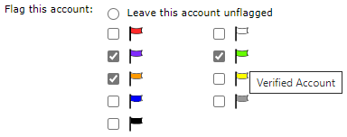 Account Flag functionality allows to create custom flags within the system to assign to user accounts. These can be used to mark users accounts for any number of practical reasons.