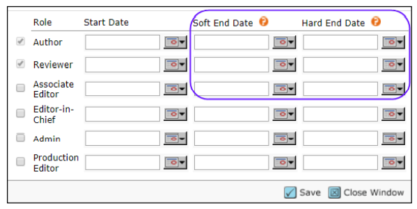 When a Soft End Date is entered for a role, the user will have the privileges of that role only for papers they were already working on, but will not be able to be assigned any new papers under that role. This function is particularly useful for editors who will be leaving their role, but, need to complete work on manuscripts assigned during their tenure.