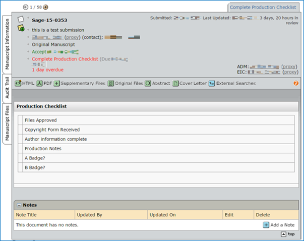 The purpose of the Production Checklist is to ensure that the manuscript is ready to go out to production before being assigned to batch. Any changes that need to be made to the contents of the manuscript and manuscript files should be completed at this time.